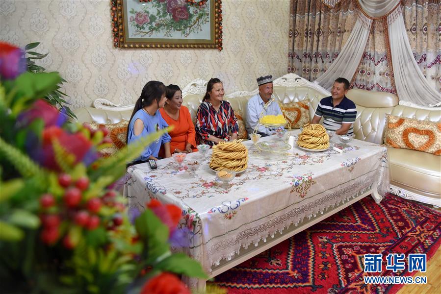 在新疆喀什地区泽普县桐安乡,居民热萨来提·里提甫(左二)一家和邻居在新居里聊天(8月16日摄)。 新华社记者 丁磊 摄