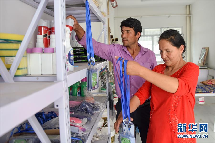 在新疆喀什地区泽普县桐安乡,买合肉甫·木拉吧(左)和妻子热娜古丽·喀尔曼在自家的百货商店里整理货物(8月15日摄)。 新华社记者 丁磊 摄