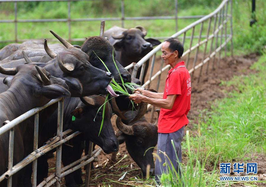 在广西融安县大良镇古兰村古兰屯养牛基地,68岁的韦肇翠在喂牛(8月18日摄)。韦肇翠是养牛基地的饲养员,每个月有2800元的工资。 新华社记者 黄孝邦 摄