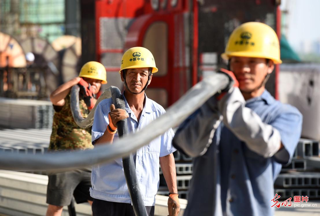 2019年8月18日,江苏省淮安市,工人们在高铁淮安东站建设工地紧张地忙碌。淮安东站将是宁淮城际铁路、京沪高铁二线、淮扬镇铁路、徐宿淮盐铁路、淮蚌铁路等多条客运铁路的重要枢纽站点,预计于2019年12月15日建成投入使用,年底淮安将迎来高铁时代。(贺敬华摄/光明图片)