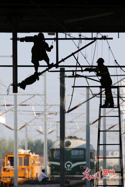 2019年8月18日,江苏省淮安市,工人们在高铁淮安东站建设工地紧张地忙碌。淮安东站将是宁淮城际铁路、京沪高铁二线、淮扬镇铁路、徐宿淮盐铁路、淮蚌铁路等多条客运铁路的重要枢纽站点,预计于2019年12月15日建成投入使用,年底淮安将迎来高铁时代。(贺敬华摄/光明图片)