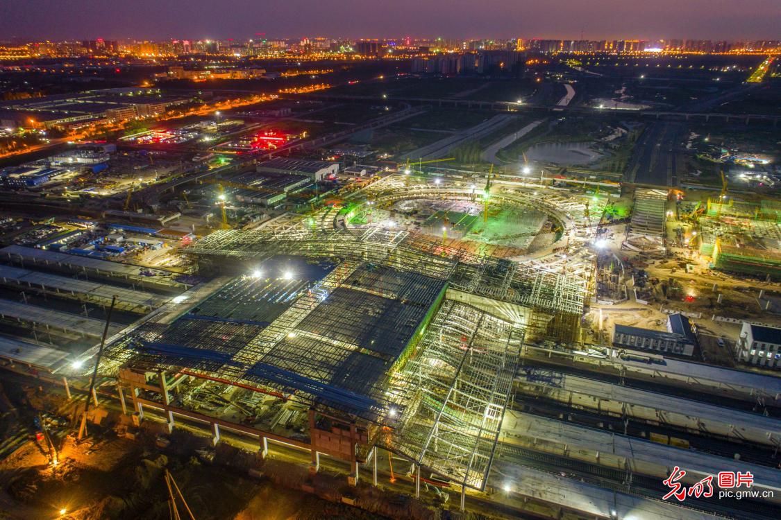 2019年8月18日,江苏省淮安市,工人们在高铁淮安东站建设工地紧张地忙碌。淮安东站将是宁淮城际铁路、京沪高铁二线、淮扬镇铁路、徐宿淮盐铁路、淮蚌铁路等多条客运铁路的重要枢纽站点,预计于2019年12月15日建成投入使用,年底淮安将迎来高铁时代。(贺敬华摄/光明图片)
