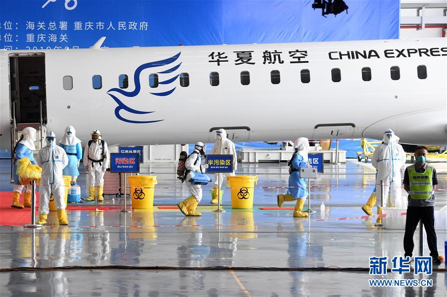 8月19日,海关工作人员完成机舱检疫处置后离开。新华社记者 唐奕 摄