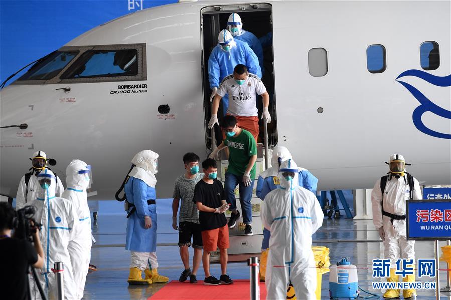 8月19日,“机上人员”在海关工作人员带领下出舱。新华社记者 唐奕 摄