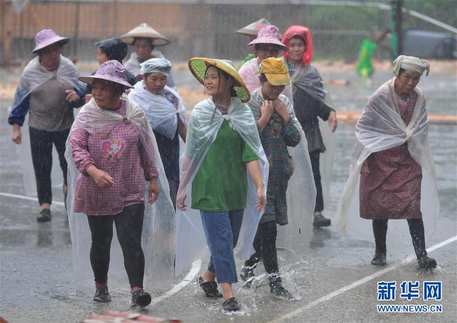 在乌英苗寨,13岁的吴兰花(前左二)和参与修建新木楼的大人们一起冒雨前往施工现场(7月6日摄)。 乌英苗寨位于黔桂交界的大苗山深处,共有140户600多人,其中100户属广西柳州市融水苗族自治县杆洞乡党鸠村,40户属贵州省从江县翠里瑶族壮族乡南岑村。近年来,随着脱贫攻坚工作深入推进,乌英苗寨群众的生活有了改观,孩子们的暑假生活也在发生变化。孩子们的时尚玩具多了起来,暑期爱心活动种类多样,孩子们也参与力所能及的劳动,与大人们一同为苗寨的发展贡献力量。 新华社记者 黄孝邦 摄