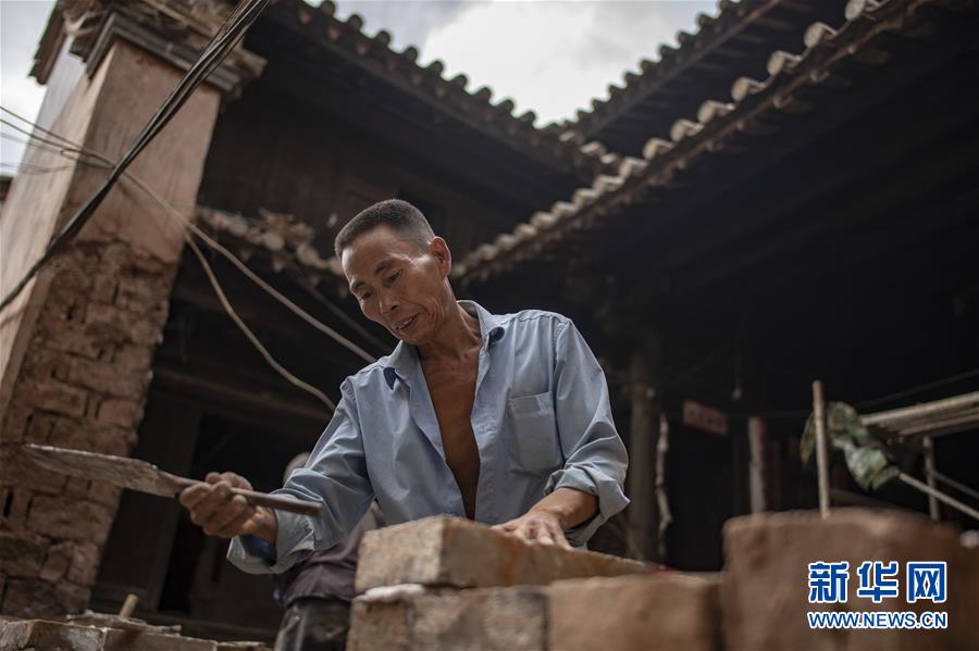 工人王建雄在修缮石屏县异龙镇符家营村189号民居的围墙(8月8日摄)。新华社记者 江文耀 摄