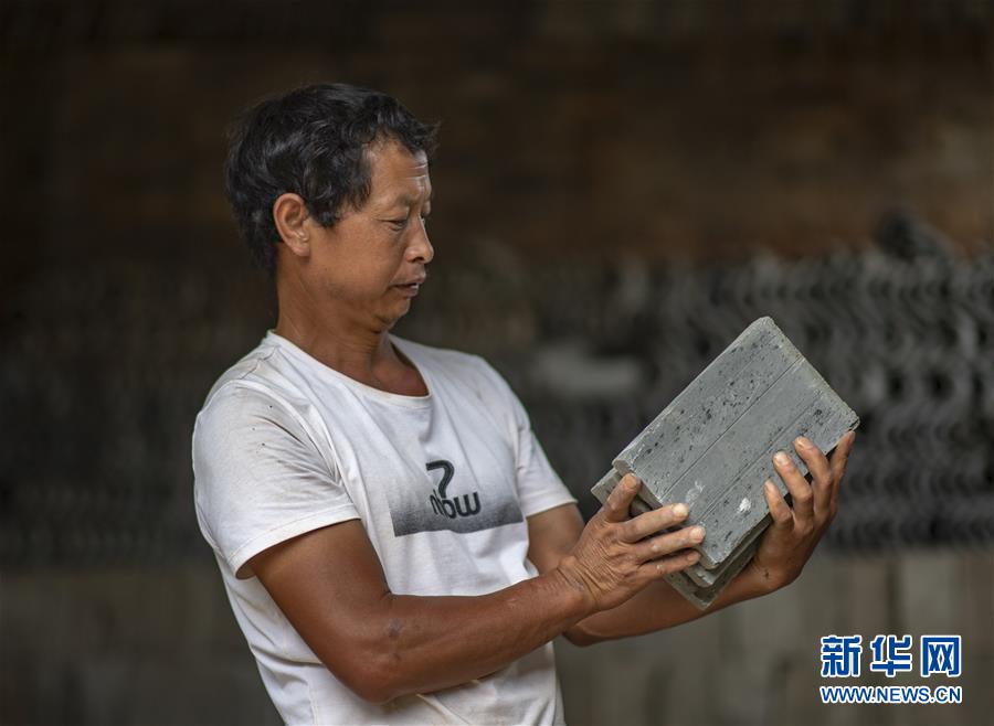 石屏县异龙镇符家营村村支书杨松在挑选准备用于修缮老屋的地砖(8月8日摄)。新华社记者 江文耀 摄