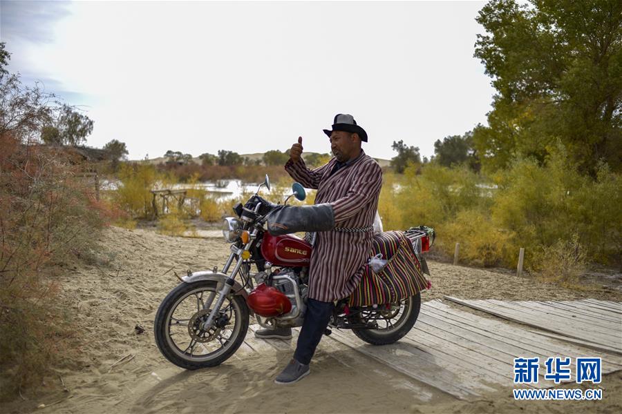 在罗布人村寨,阿木东·艾不东骑着摩托车向游客打招呼(2018年10月16日摄)。新华社记者 赵戈 摄