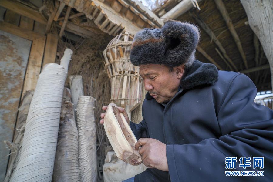 在罗布人村寨,阿木东·艾不东在家中制作卡盆模型(1月29日摄)。新华社记者 赵戈 摄