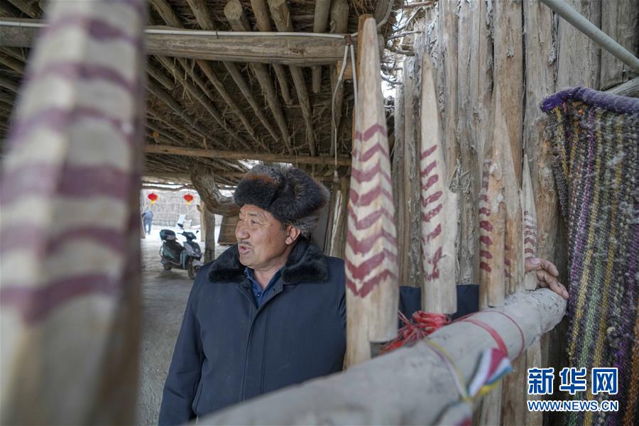 阿木东·艾不东在罗布人村寨的家里(1月29日摄)。他家的装修都突出了当地文化。新华社记者 赵戈 摄