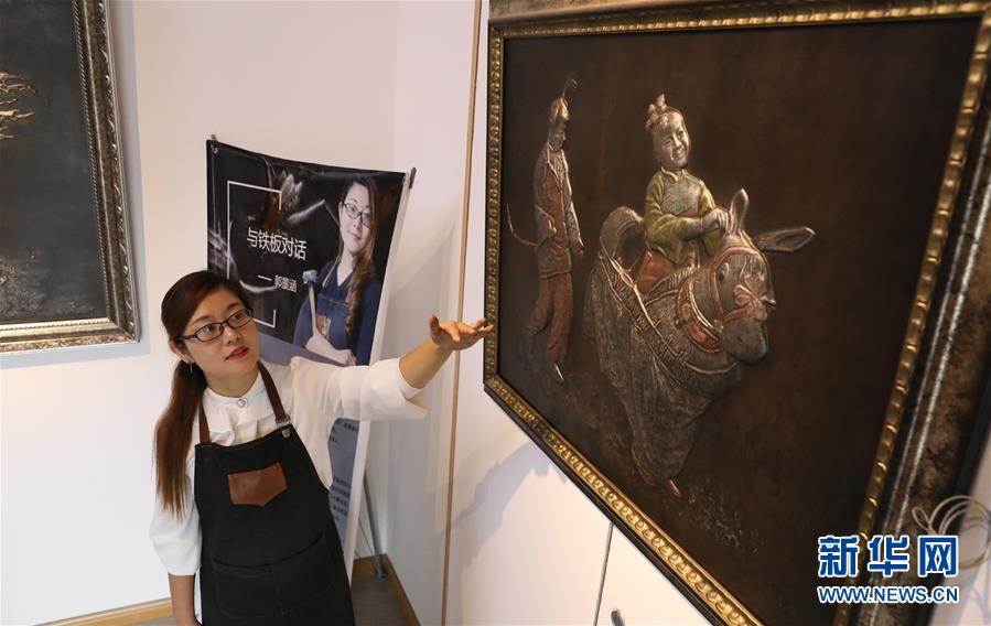8月19日,在石家庄市“郭氏铁板浮雕”工作室,郭墨涵展示自己创作的铁板浮雕作品。 新华社记者 赵丹惠 摄