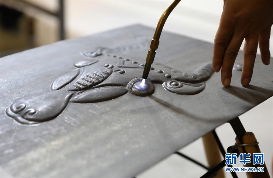 8月19日,在石家庄市“郭氏铁板浮雕”工作室,郭墨涵对铁板浮雕进行烧色。 新华社记者 赵丹惠 摄