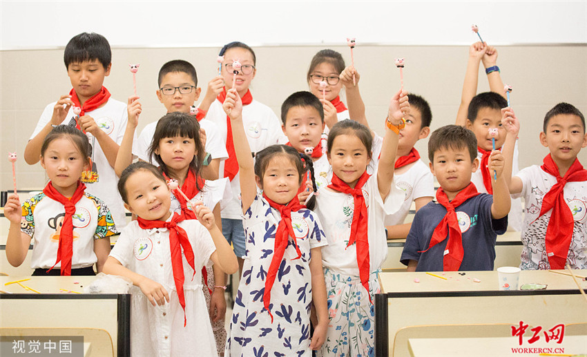 2019年8月20日,学生在江苏南通如皋市文化馆里学习非遗面塑制作。