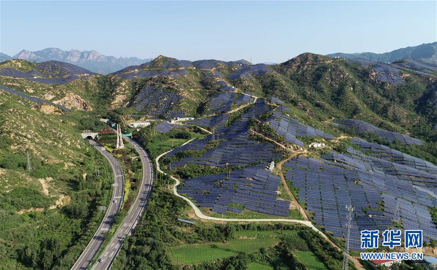 这是通往西柏坡的高速公路和西柏坡镇一处荒山上的光伏发电场(8月16日无人机拍摄)。新华社记者杨世尧摄