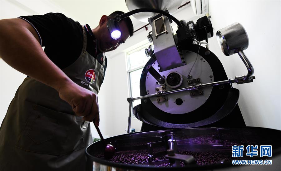 巴斯克斯在琼海市的咖啡烘焙坊内烘焙咖啡豆(8月11日摄)。新华社记者 杨冠宇 摄
