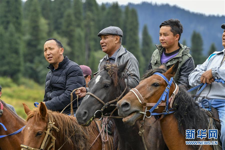 巴合提别克·塞依提(右三)在新疆巩留县阿尕森镇库尔德宁禁牧区巡逻(8月16日摄)。新华社记者胡虎虎摄