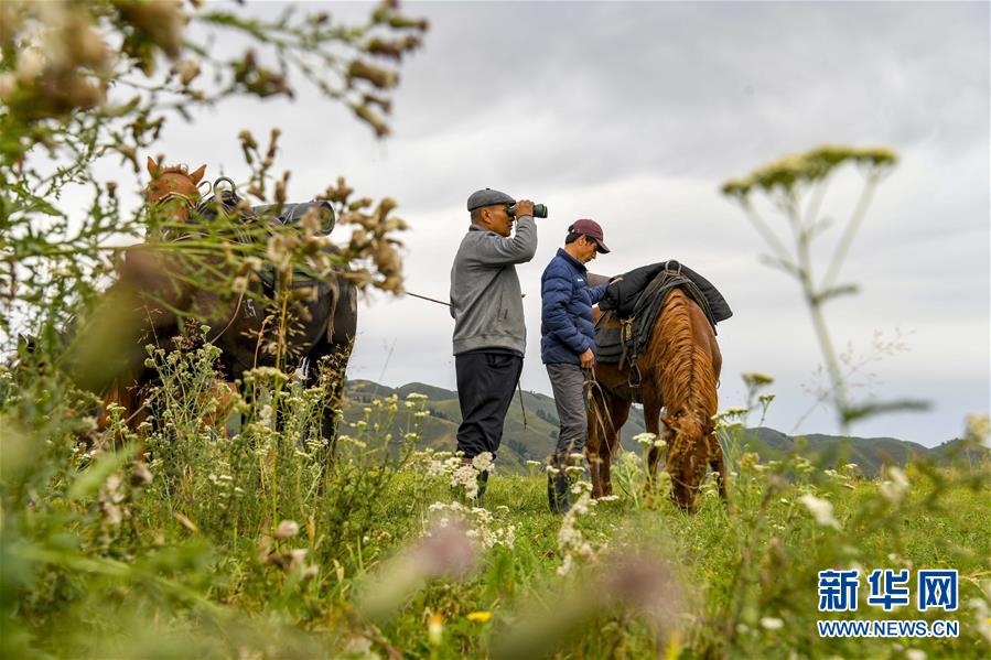 巴合提别克·塞依提(左)与同伴一起在新疆巩留县阿尕森镇库尔德宁禁牧区巡逻(8月16日摄)。新华社记者胡虎虎摄