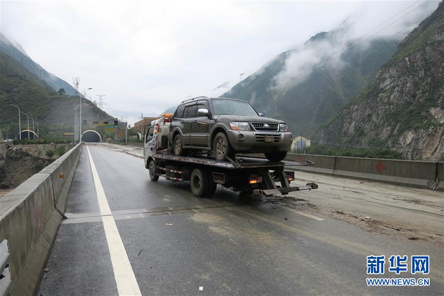 8月20日,在汶川县绵虒镇,救援车辆拖运被困车辆驶离救援现场。 8月20日凌晨2时许,四川省阿坝州汶川县因强降雨致多个乡镇不同程度发生山洪泥石流灾害,多地道路、电力、通讯中断,造成人员伤亡。1名消防员在救援中牺牲。 新华社发 (唐盈 摄)