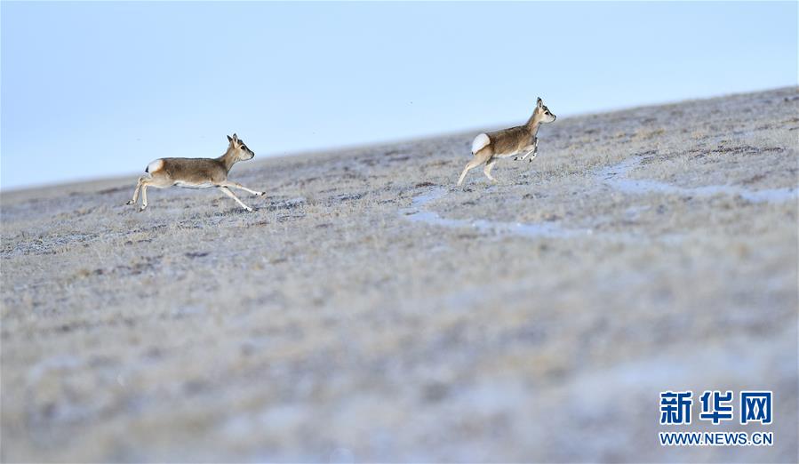 两只小藏羚羊在冬日清晨的可可西里奔跑(2016年12月2日摄)。新华社记者 吴刚 摄