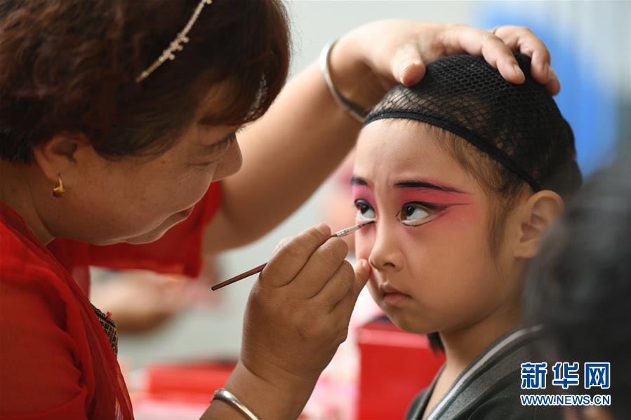 8月20日,在石家庄市井陉县亲亲宝贝幼儿园,微水丝弦艺人(左)在给小朋友化装。 微水丝弦属于河北石家庄地方戏曲,是河北省级非物质文化遗产项目,唱腔优美,戏装华丽,在当地深受百姓喜爱。近日,井陉县微水丝弦的艺人们走进当地幼儿园,向孩子们展示丝弦艺术,介绍戏曲基本知识,将民间艺术融入孩子们的心间。 新华社记者 赵丹惠 摄