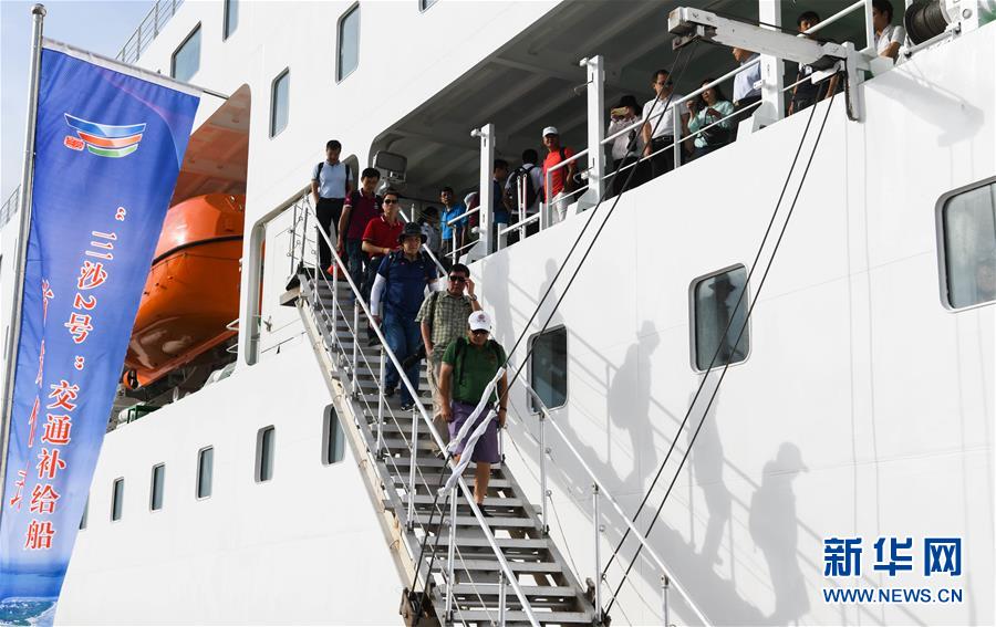 8月21日,“三沙2号”交通补给船抵达永兴岛后,参加首航的乘客陆续下船。 新华社记者 杨冠宇 摄