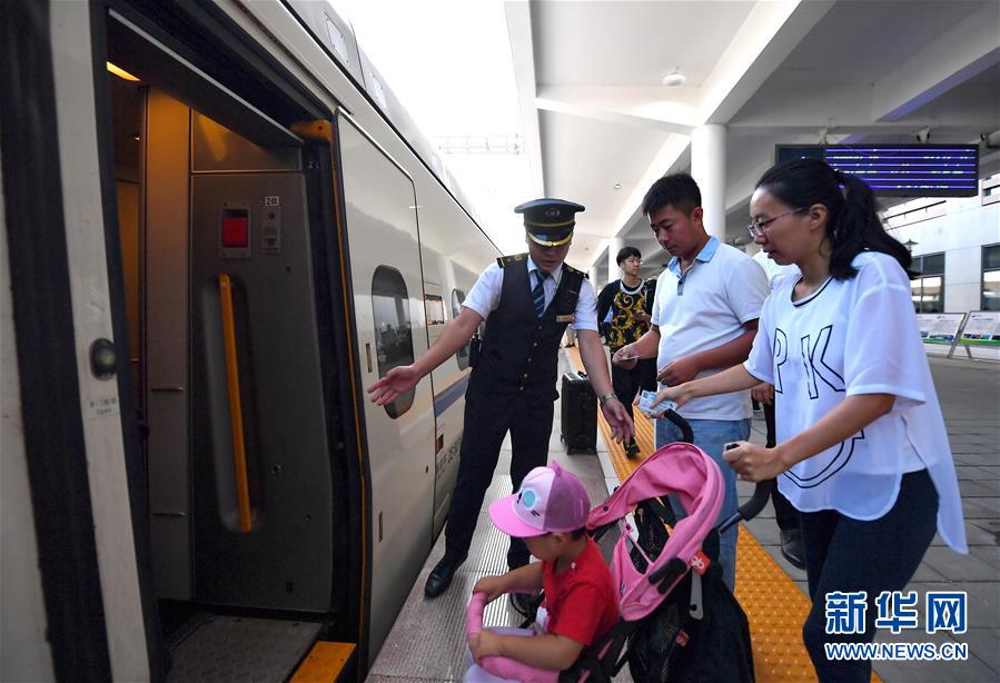 8月21日,D6622次列车乘务员在曹妃甸东站引导乘客上车。新华社记者 杨世尧 摄
