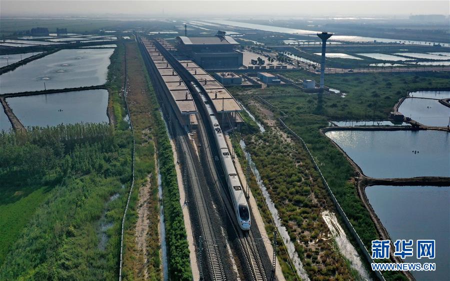 8月21日,曹妃甸东站开往北京南站的D6622次列车驶出曹妃甸东站(无人机拍摄)。新华社记者 杨世尧 摄
