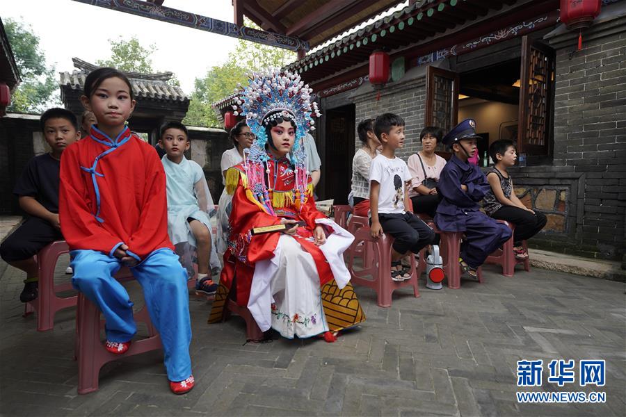 8月20日,孩子们在河北省秦皇岛市北戴河“裴艳玲艺术传承基地”观看京剧表演。 暑假期间,河北省秦皇岛市北戴河“裴艳玲艺术传承基地”——梨园小院开设京剧培训班,免费教授孩子们京剧表演艺术,同时借助基地平台为中外游客演出,锻炼孩子们的表演技能,传承戏曲艺术。 新华社记者 邢广利 摄