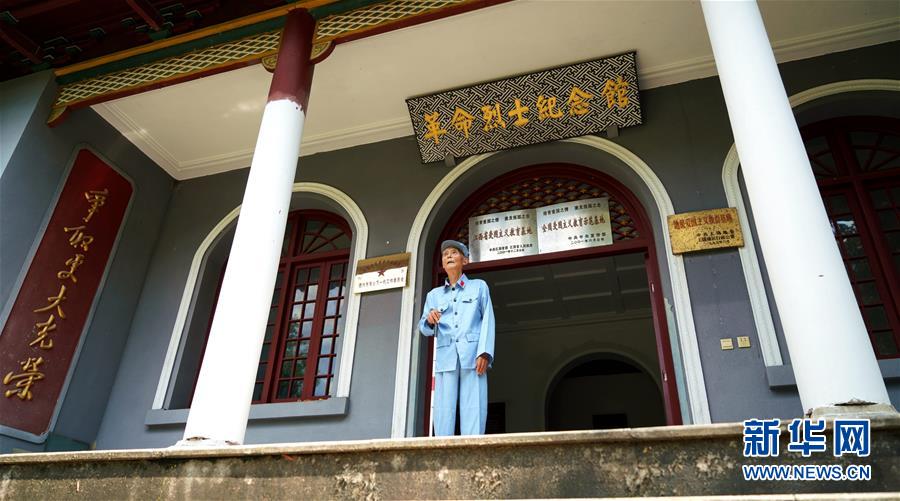 程樟柱在江西省德兴市龙头山革命烈士纪念馆大门等待前来参观的游客(7月25日摄)。新华社记者 胡晨欢 摄