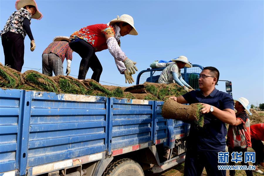 8月21日,在河北任县西固城乡小东吴村,王壮(前右一)和农场工人一起将收卷的草皮装车。 新华社记者 朱旭东 摄