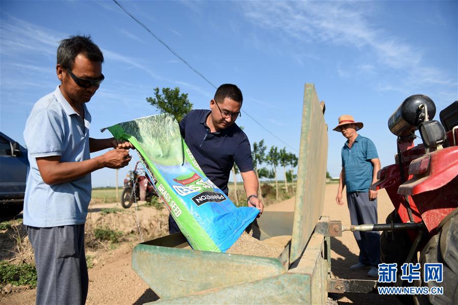 8月21日,在河北任县西固城乡小东吴村,王壮(左二)和农场工人一起将草种子投入播种机准备播种。 新华社记者 朱旭东 摄