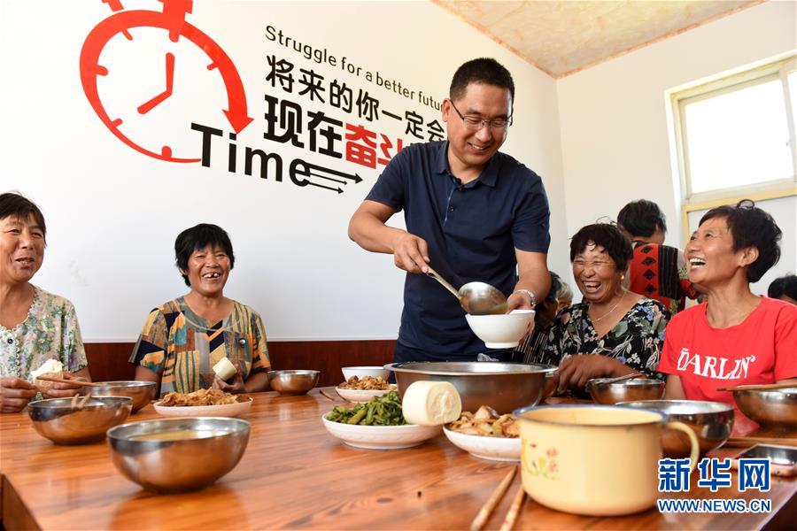 8月21日,在河北任县西固城乡小东吴村,王壮(中)和农场工人一起吃午饭。 新华社记者 朱旭东 摄
