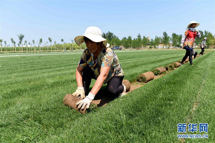 8月21日,在河北任县西固城乡小东吴村,景泰园家庭农场的工人在收卷草皮。 新华社记者 朱旭东 摄