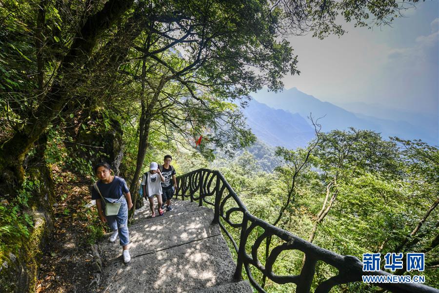 游客在重庆金佛山风景区内的绝壁栈道上游览体验(8月20日摄)。 重庆市南川区的金佛山风景区属典型的喀斯特地貌,风景秀美,吸引了不少游客。 新华社记者 刘潺 摄
