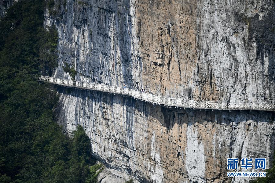 游客在重庆金佛山风景区内的绝壁栈道上游览体验(8月20日摄)。 重庆市南川区的金佛山风景区属典型的喀斯特地貌,风景秀美,吸引了不少游客。 新华社记者 刘潺 摄