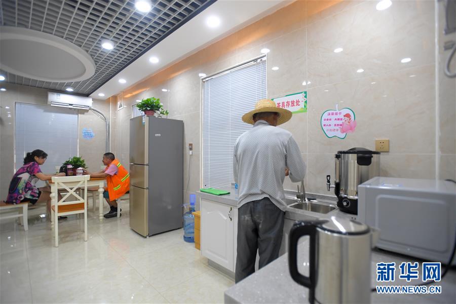 8月21日,市民和环卫工人在长沙市开福区“城市驿站”司马里站休息。 连日来,湖南长沙持续高温,许多市民、游客和户外劳动者来到“城市驿站”休憩纳凉。位于长沙市开福区的“城市驿站”司马里站近日正式对外开放,驿站有休息区、阅读区和生活区,彩电、空调、桌椅、医药箱、WiFi等设施设备一应俱全。作为当地打造“15分钟生活圈”的民生工程之一,目前长沙市开福区投入使用的“城市驿站”已有7个,未来还将在人流量较大、需求较高的路段新建一批“城市驿站”,打造更多“共享空间”。 新华社记者 陈泽国 摄