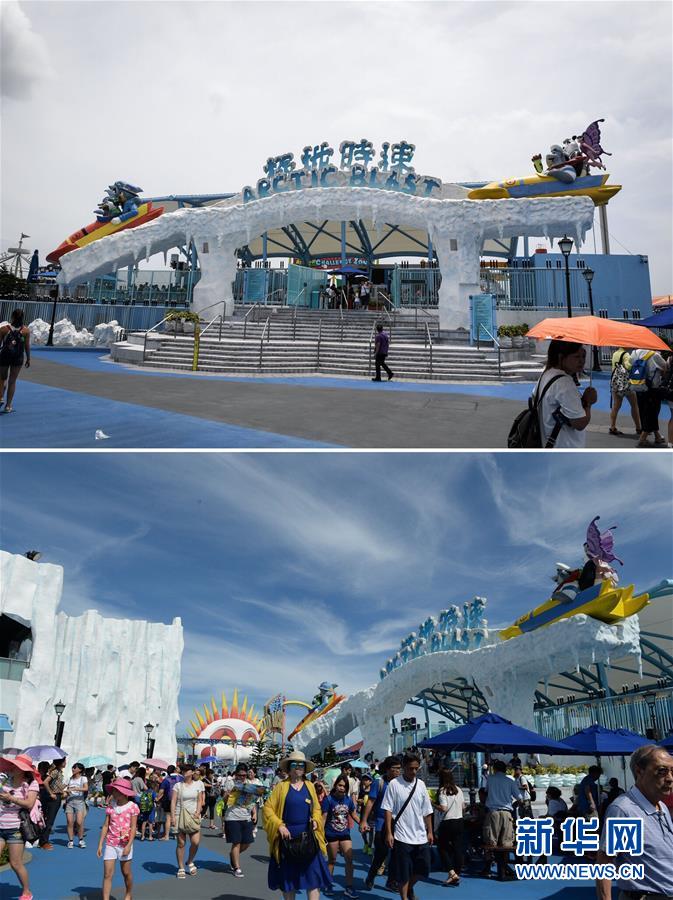 这是一张拼版照片:上图为8月20日,香港海洋公园一景(新华社记者毛思倩摄);下图为2015年8月2日拍摄的游客在香港海洋公园游览(新华社记者秦晴摄)。 近期一系列的社会事件使香港旅游业备受重创。香港特区政府商务及经济发展局数据显示,香港的旅客人次同比增幅已由6月的正值逐渐变为负值,8月初跌幅变为31%,香港酒店入住率7月开始出现双位数同比跌幅,香港零售业表现预计8月滑向双位数跌幅。 新华社发