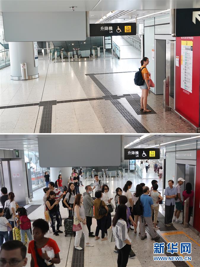 这是一张拼版照片:上图为8月21日,高铁香港西九龙站,一位旅客在等电梯(新华社记者毛思倩摄);下图为2018年10月1日拍摄的旅客们在高铁香港西九龙站排队等候电梯(新华社记者吴晓初摄)。 近期一系列的社会事件使香港旅游业备受重创。香港特区政府商务及经济发展局数据显示,香港的旅客人次同比增幅已由6月的正值逐渐变为负值,8月初跌幅变为31%,香港酒店入住率7月开始出现双位数同比跌幅,香港零售业表现预计8月滑向双位数跌幅。 新华社发