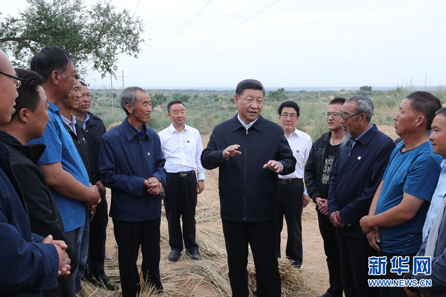 8月19日至22日,中共中央总书记、国家主席、中央军委主席习近平在甘肃考察。这是21日上午,习近平在武威市古浪县八步沙林场同“六老汉”代表及林场职工亲切交谈。 新华社记者 鞠鹏 摄