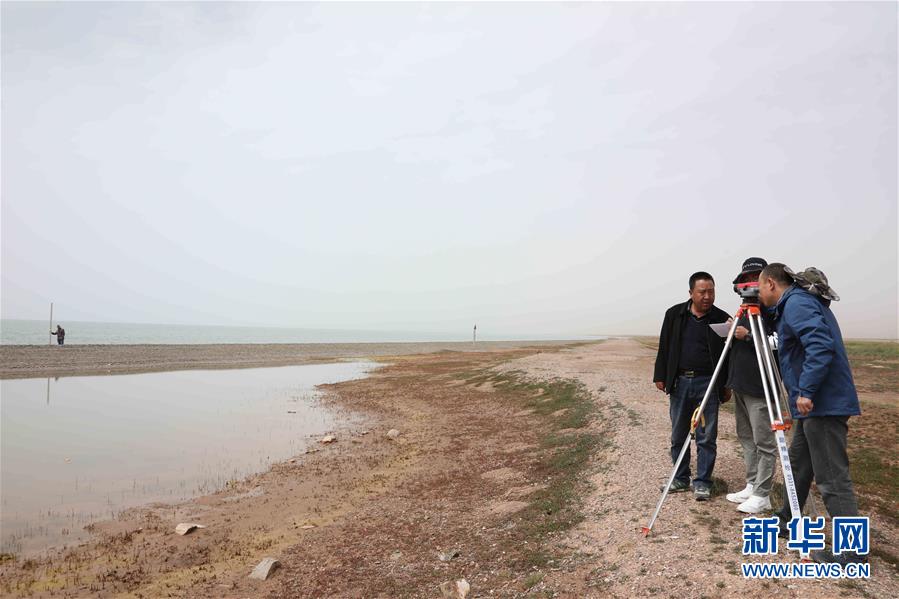玛多水文勘测分队工作人员用经纬仪对鄂陵湖水位进行断面测量(8月20日摄)。 新华社记者 刘诗平 摄