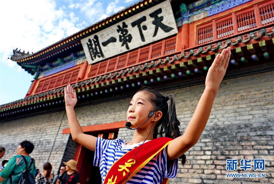 8月22日,秦皇岛市山海关区“关城小导游”社会实践班的小导游在天下第一关城楼为游客讲解。 暑假期间,河北省秦皇岛市山海关区教育和体育局开设“关城小导游”社会实践班,学生可以自愿参加,在山海关长城博物馆、老龙头、天下第一关等景点义务为游客讲述山海关故事,讲解长城历史文化,让孩子们在深入了解长城文化、传播长城文化的过程中,锻炼表达能力、人际交往能力,全面提升自身综合素质。 新华社记者 杨世尧 摄