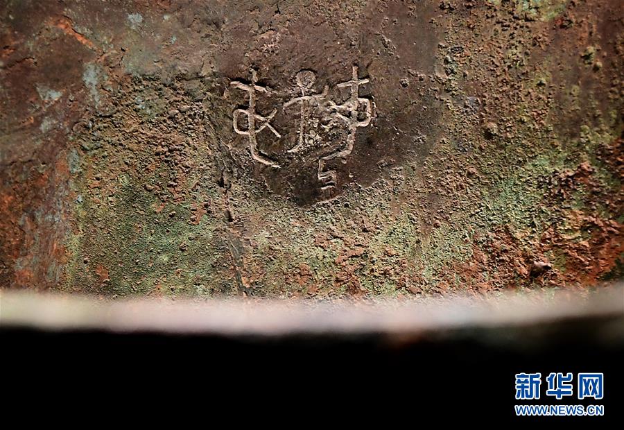 这是在河南安阳妇好墓出土的“‘好’连体铜甗”内壁上的铭文(2018年10月12日摄)。 新华社记者 李安 摄