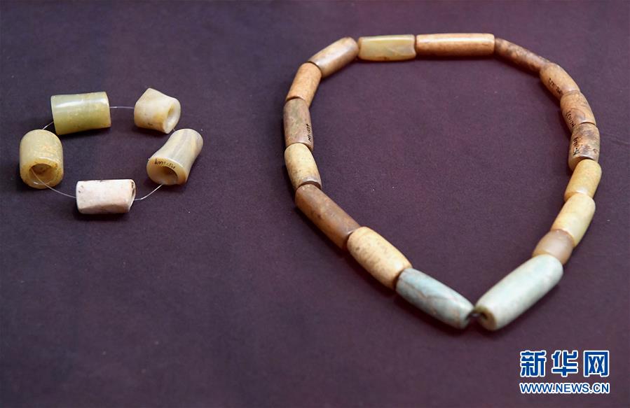 这是在河南安阳妇好墓出土的玉串饰(2018年10月12日摄)。 新华社记者 李安 摄