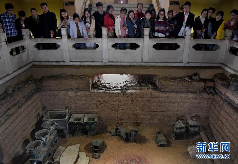 游客在河南安阳殷墟宫殿宗庙遗址内的妇好墓参观(2018年10月12日摄)。 新华社记者 李安 摄