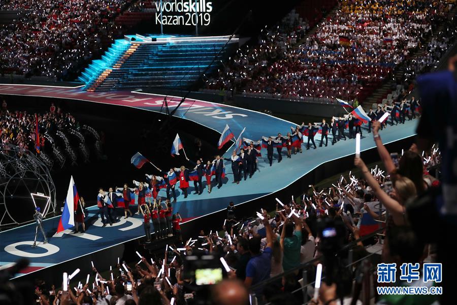 8月22日,在俄罗斯喀山体育场,俄罗斯代表团在第45届世界技能大赛开幕式上出场。 第45届世界技能大赛22日在俄罗斯鞑靼斯坦共和国首府喀山开幕,中国代表团的63名参赛选手将参加全部项目的比赛,向世界展示“大国工匠”的风采。 本届世界技能大赛将持续至27日,来自世界技能组织69个成员国家和地区的1355名选手将在6大类56个项目上展开竞技。 新华社记者 鲁金博 摄