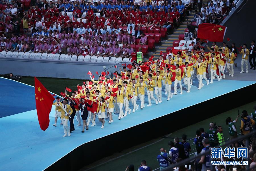 8月22日,在俄罗斯喀山体育场,中国代表团在第45届世界技能大赛开幕式上出场。 第45届世界技能大赛22日在俄罗斯鞑靼斯坦共和国首府喀山开幕,中国代表团的63名参赛选手将参加全部项目的比赛,向世界展示“大国工匠”的风采。 本届世界技能大赛将持续至27日,来自世界技能组织69个成员国家和地区的1355名选手将在6大类56个项目上展开竞技。 新华社记者 鲁金博 摄