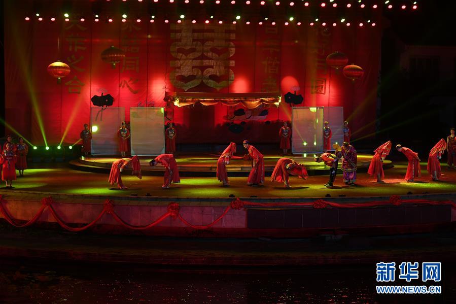 8月23日,在古镇周庄,演员在表演婚庆民俗。 在江苏昆山古镇周庄长期演出的《四季周庄》是一部呈现江南原生态文化、有本地村民参与的水乡实景演出,演出在“小桥、流水、人家”的环境中展开,表现水乡周庄的文化特质和迷人情韵,让游人感受江南的诗画生活,受到广泛欢迎。 新华社记者 季春鹏 摄
