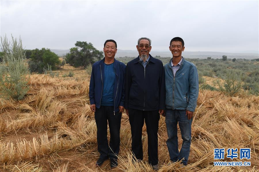 在武威市古浪县八步沙林场,八步沙第一代治沙人张润元(中)、第二代治沙人石银山(左)、第三代治沙人郭玺(右)合影留念(8月22日摄)。新华社记者 范培珅 摄