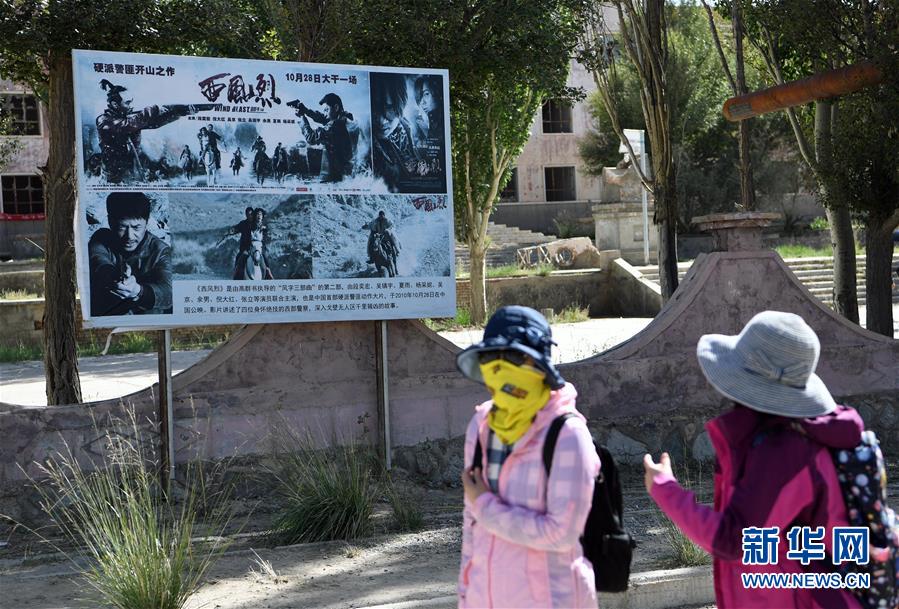 8月23日,游客在阿克塞老县城走过一块介绍在此拍摄的电影的展板。新华社记者 马宁 摄