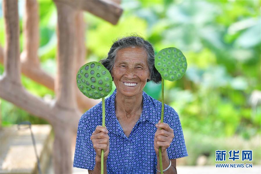 在广西鹿寨县中渡镇大兆村,80岁的黄世秀老人在展示准备出售的莲蓬(8月23日摄)。新华社记者 黄孝邦 摄